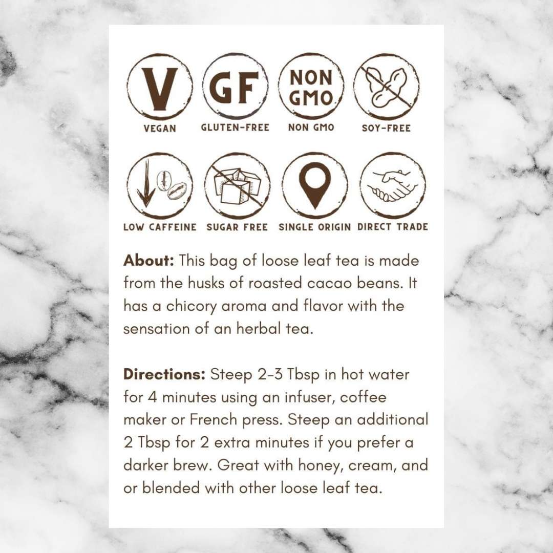 This is a 4 oz bag of loose leaf tea. Made from the husks of roasted cacao beans. It has a chocolatey aroma and flavor with the sensation of herbal tea.
